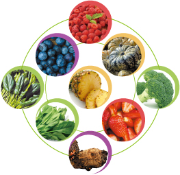 Blueberry, strawberry, raspberry, pineapple, broccoli, spinach, taro, pumpkin, mustard spinach, other processed produce, and related products.